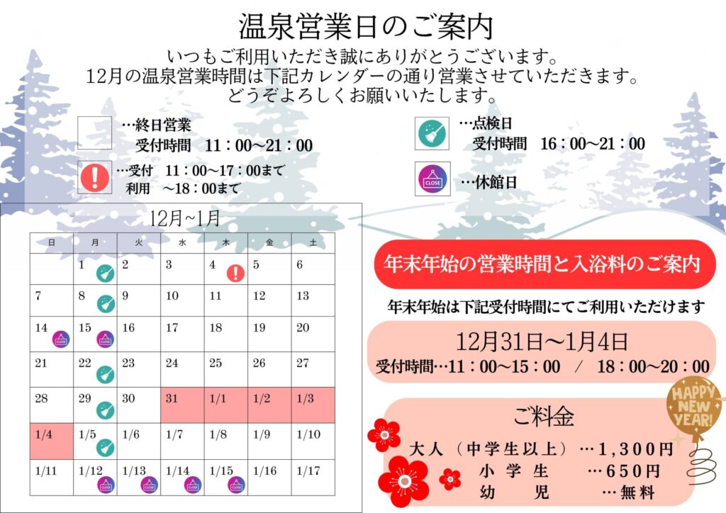 12月(年末年始~1月休館日)の外来入浴の営業時間について